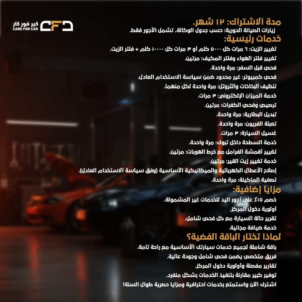 اشترك الآن في الباقة الفضية فحص شامل للسيارات واستمتع بخدمات احترافية ومزايا حصرية على مدار السنة لتبقى سيارتك بأمان!